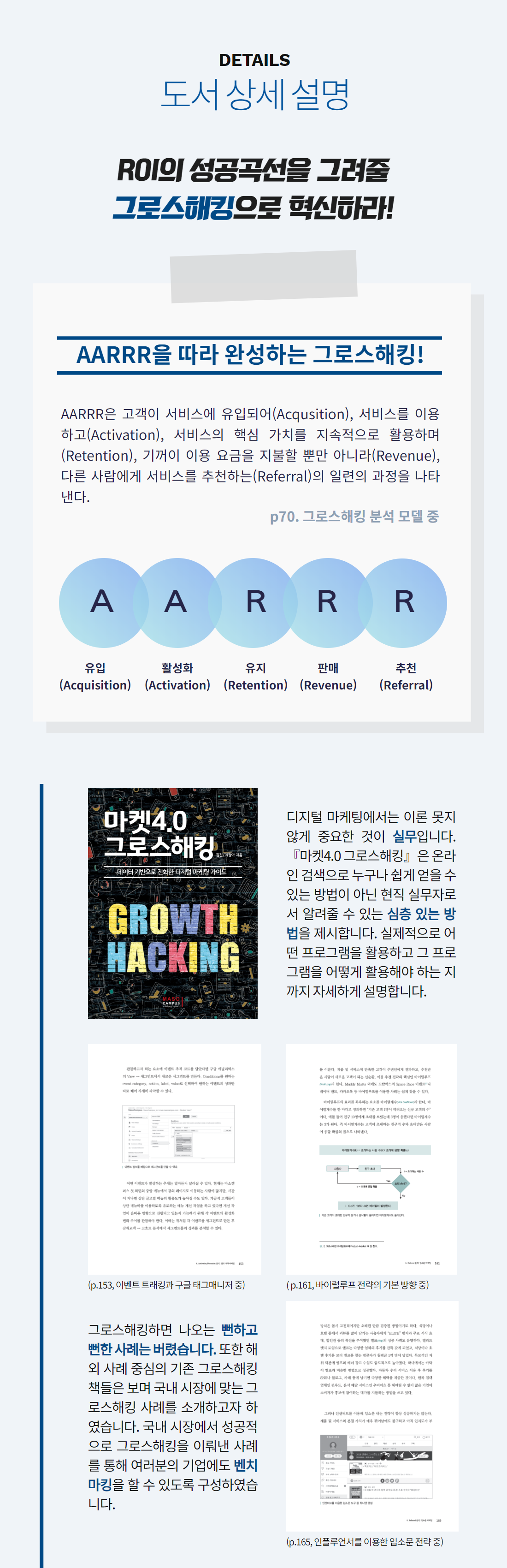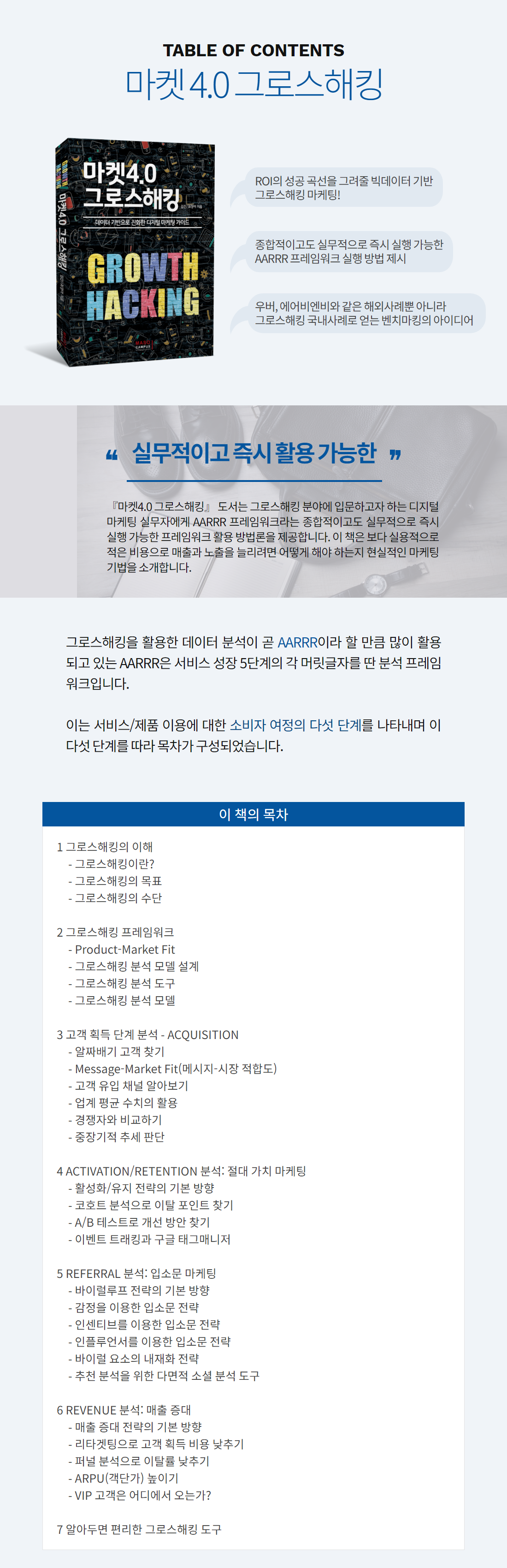 4차 산업혁명이 가져온 마켓 트렌드의 변화, 애자일/데이터 분석 기반의 디지털 마케팅으로 대비하라. AARRR을 따라 완성하는 그로스해킹. 풍부한 국내외 사례와 함께 전하는 그로스해킹 모델과 방법론