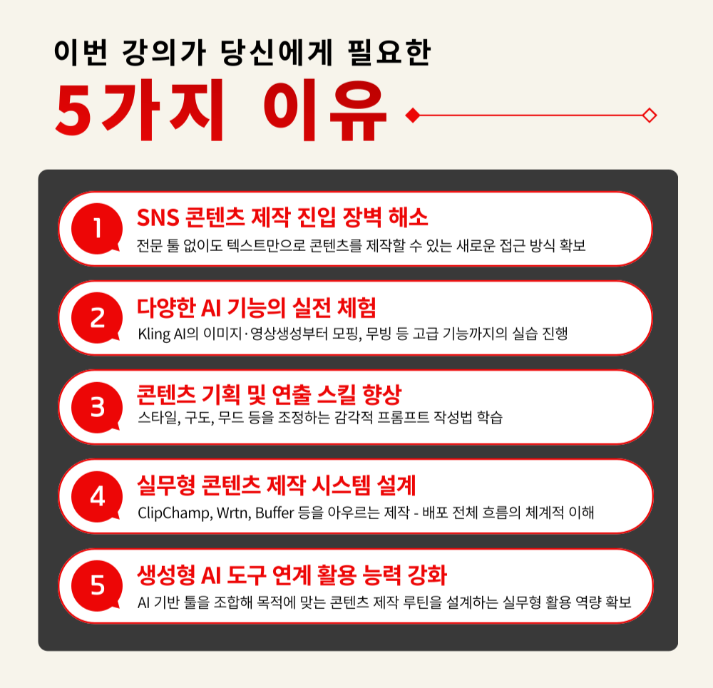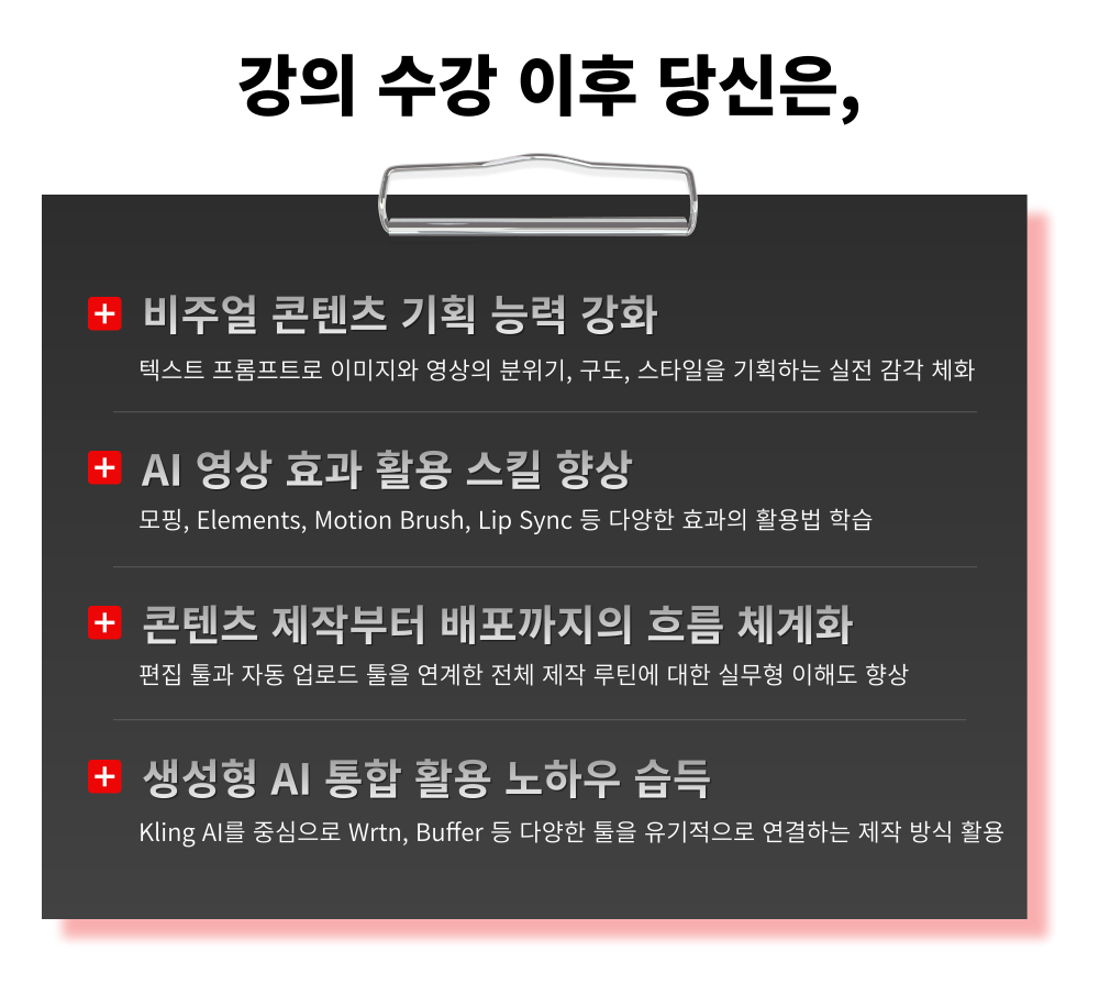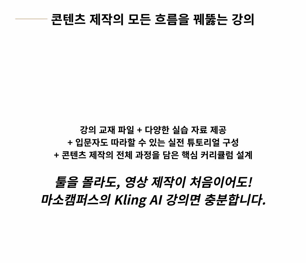 단순히 Kling AI만 배우는 게 아니라 전체 제작 과정이 연결돼 있어서 실무에 딱입니다.