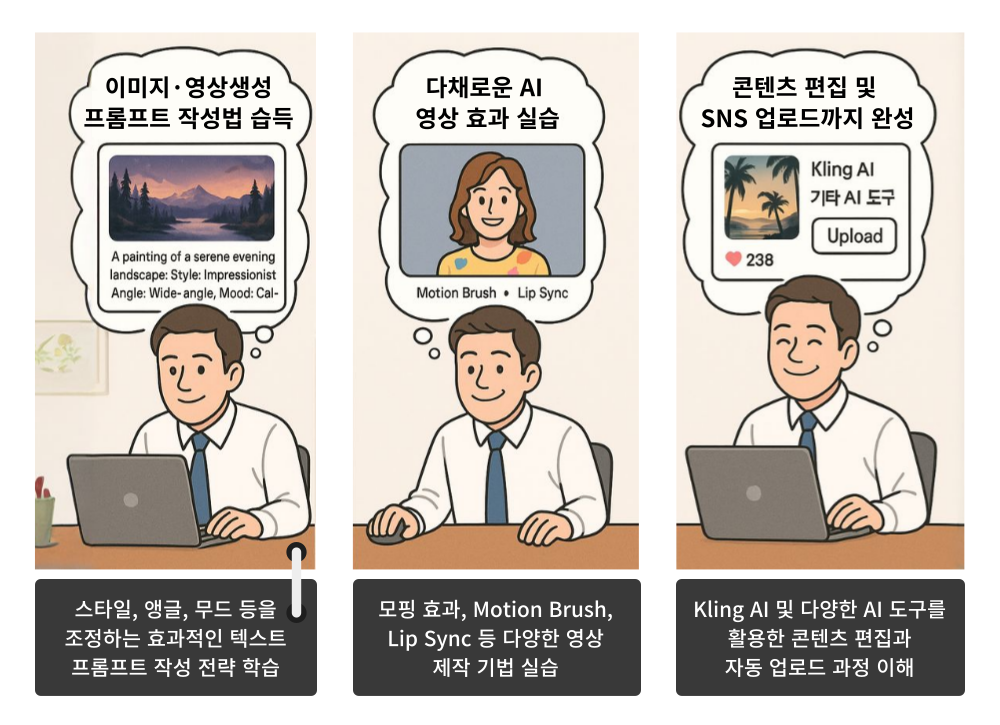 Kling AI 하나로 끝내는 영상 제작 – 기획부터 SNS 배포까지 90분 완성 커리큘럼 특징