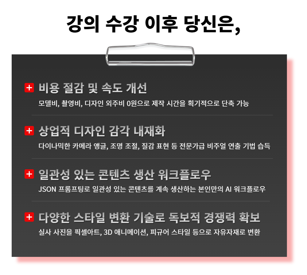 수강 전엔 AI 이미지가 잘 나오면 저장해두는 정도였는데, 지금은 JSON 프롬프트와 활용법을 제대로 익혀 원하는 톤과 방향으로 결과물을 의도대로 제작할 수 있게 됐어요.