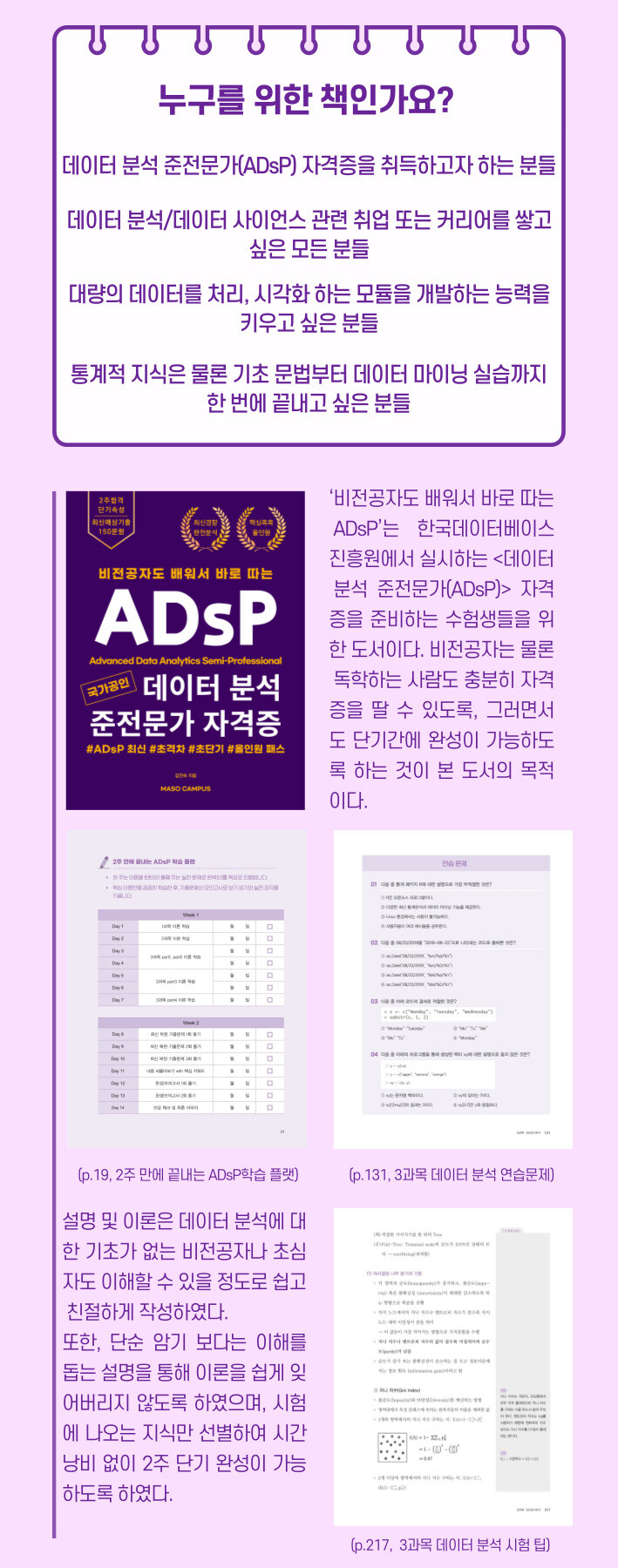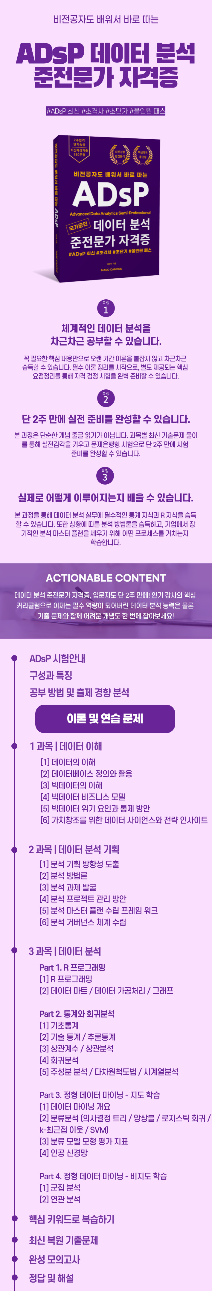 『데이터 분석 준전문가(ADsP)』 자격증 준비는 이 한권으로 끝낸다! 2주 완성 커리큘럼과 2주 맞춤 공부 계획표를 통해 혼자서도 확실하게 합격 가능! 비전공자, 입문자도 가능합니다.