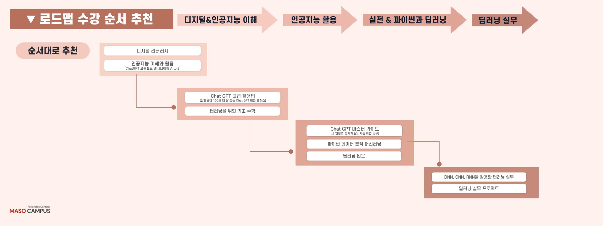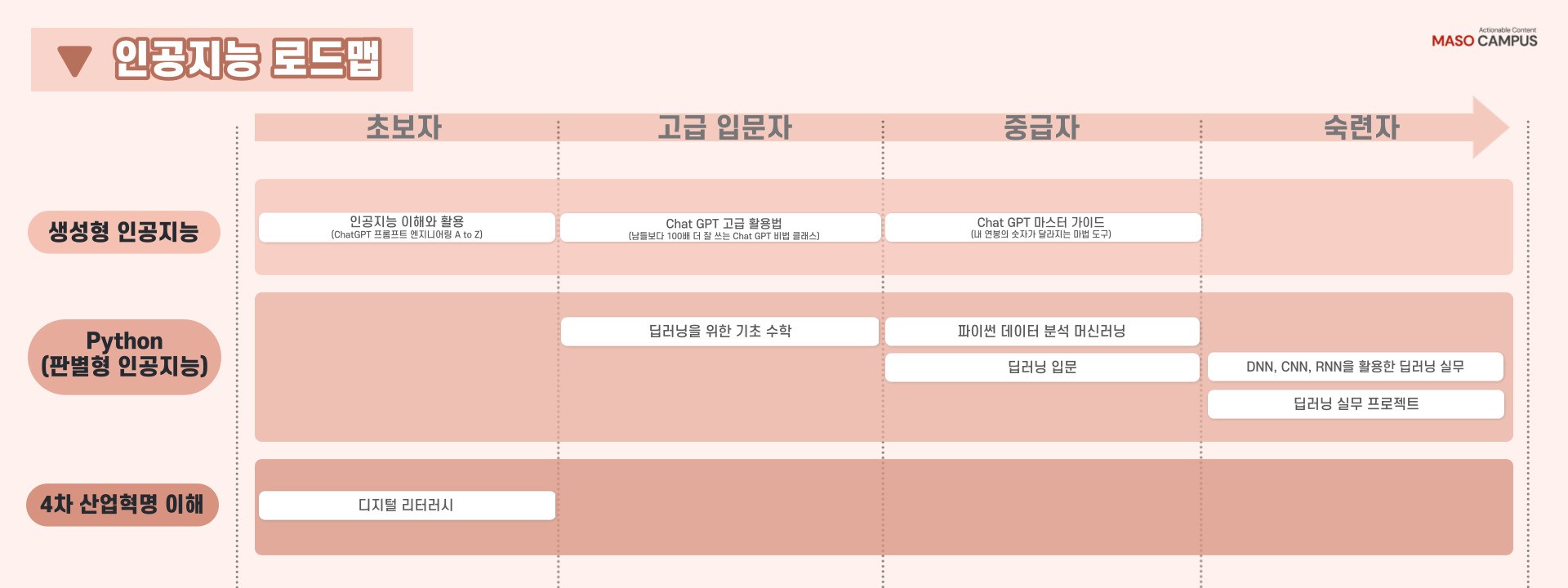 마소캠퍼스의 인공지능 로드맵은 인공지능 기술과 친해지고 여러가지 AI 기술들을 이용하여 업무 효율 상승을 경험하고, 실제 생활에도 적용할 방안을 고려할 수 있습니다